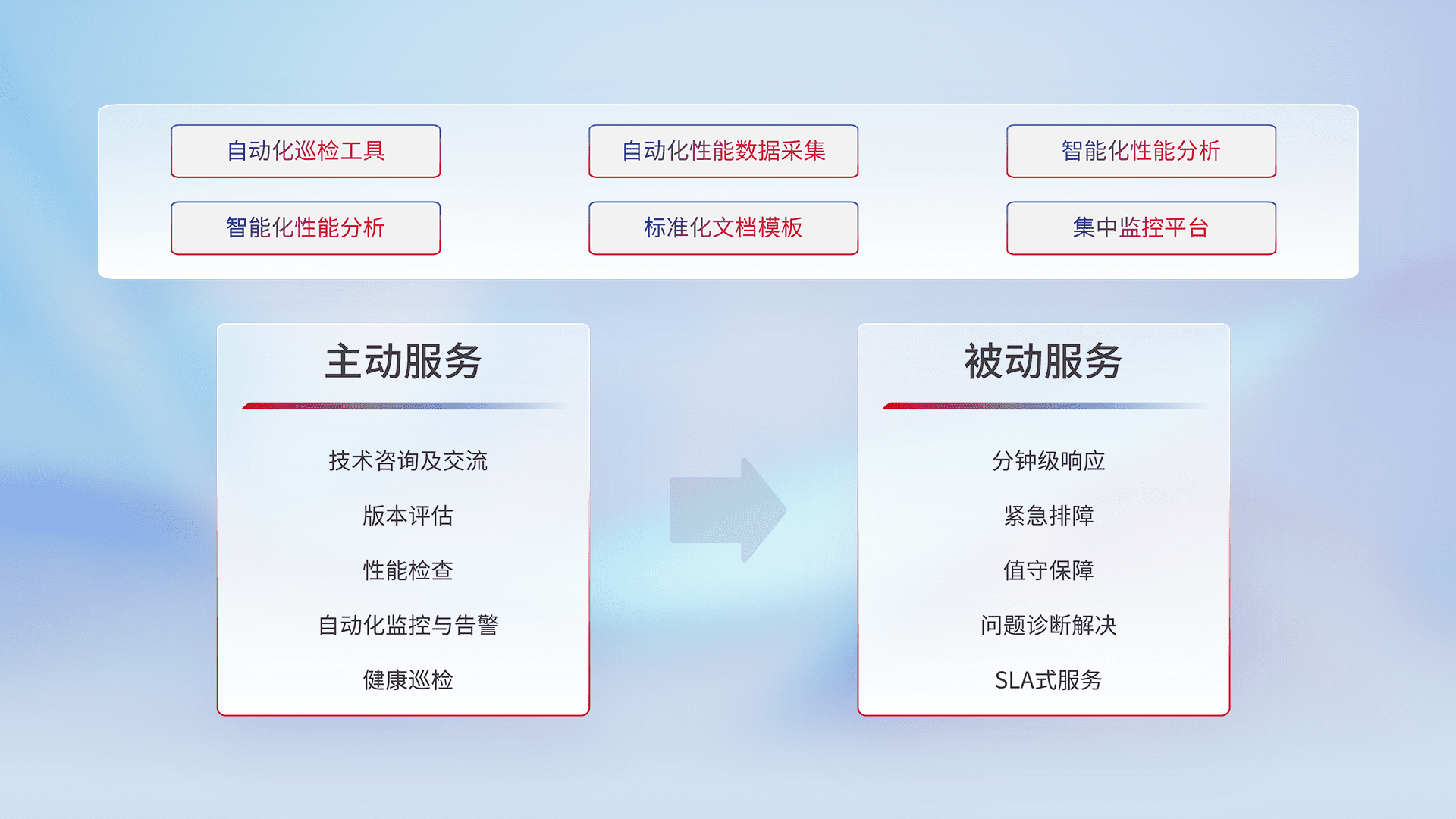 智能化工具和标准化文档,,,,保障服务质量,,,提供主动服务(包含技术咨询、、、、版本评估、、、、性能检查、、自动化监控与告警、、健康巡检)和被动服务包含(分钟级响应、、、、紧急排障、、、值守保障、、、问题诊断解决、、、、SLA服务)。。。